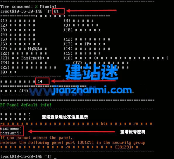 3、根据提示,输入14,就可以得到宝塔后台的链接、账户、密码了。