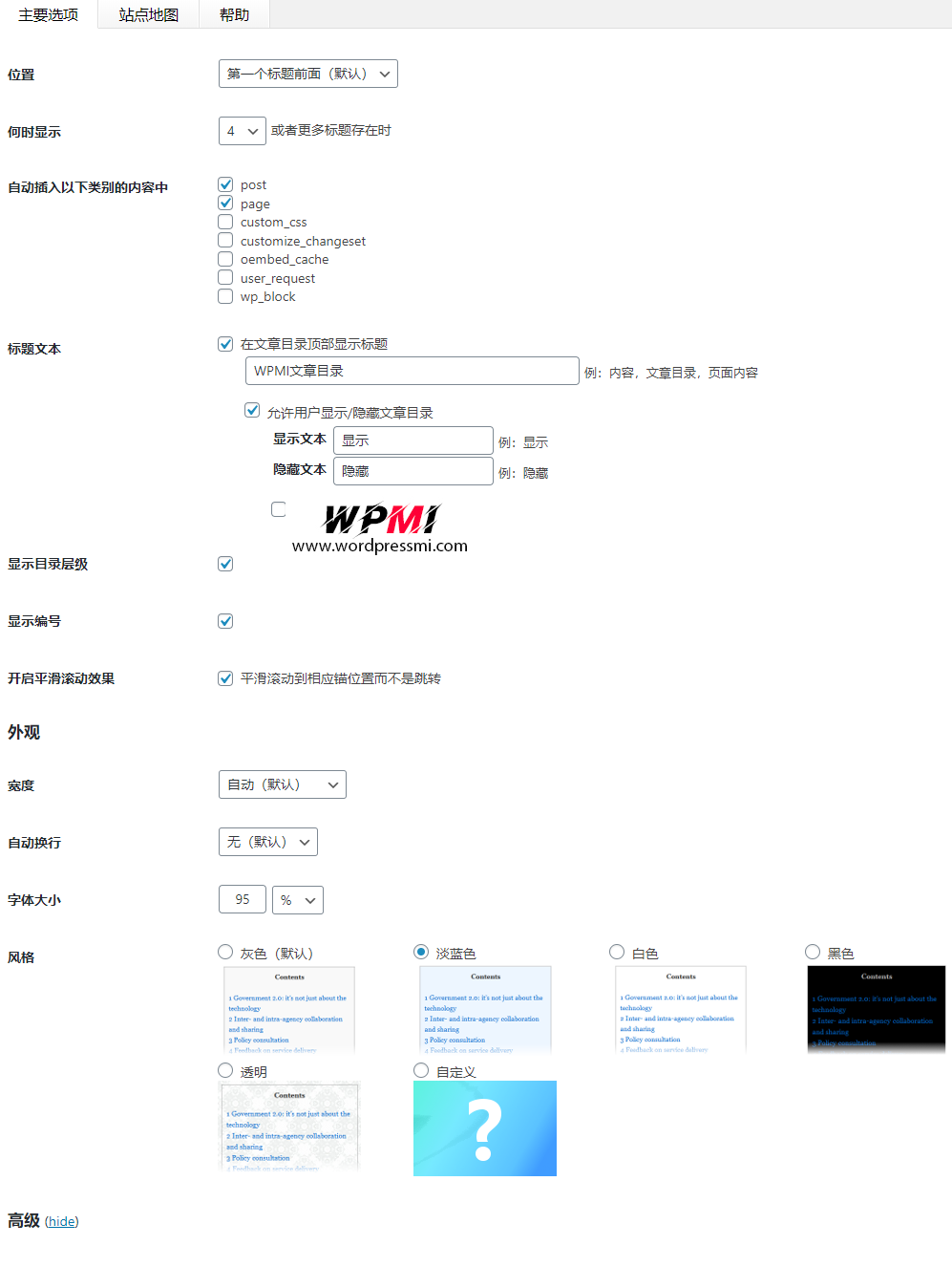 插件包括一个管理选项面板,可以在其中自定义设置(如显示位置),定义显示索引之前的最小标题数,其他外观等。