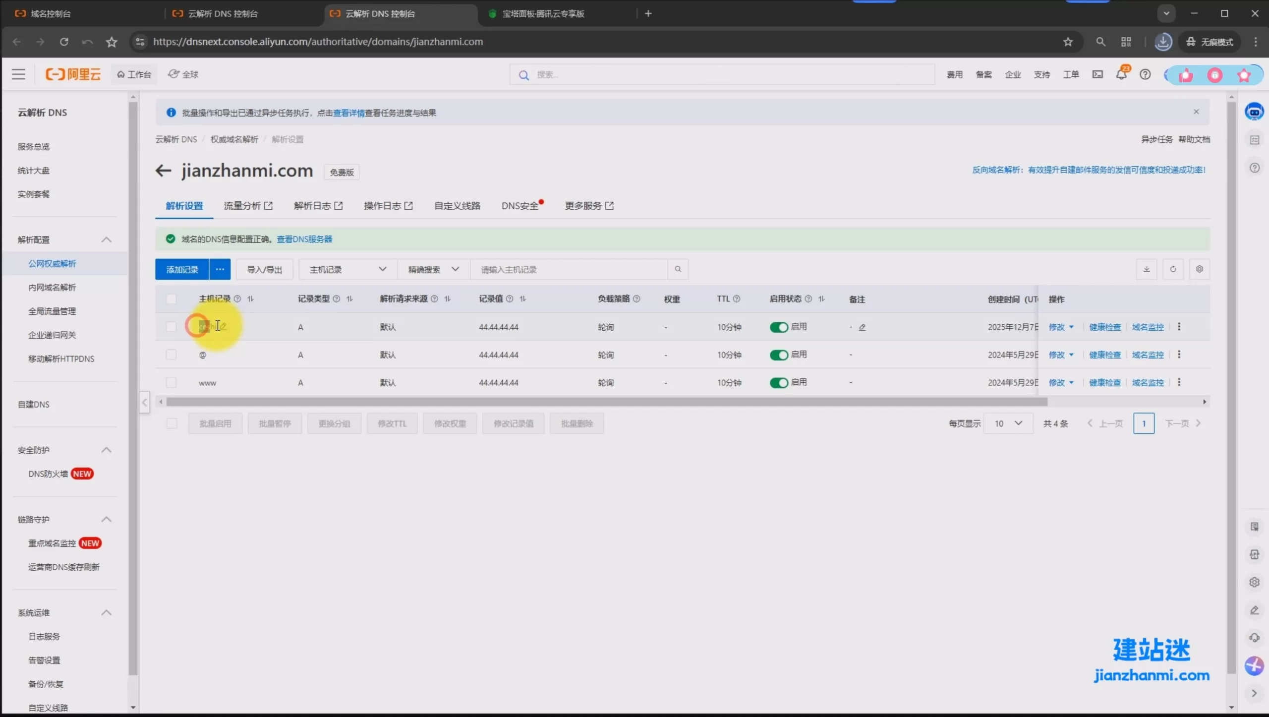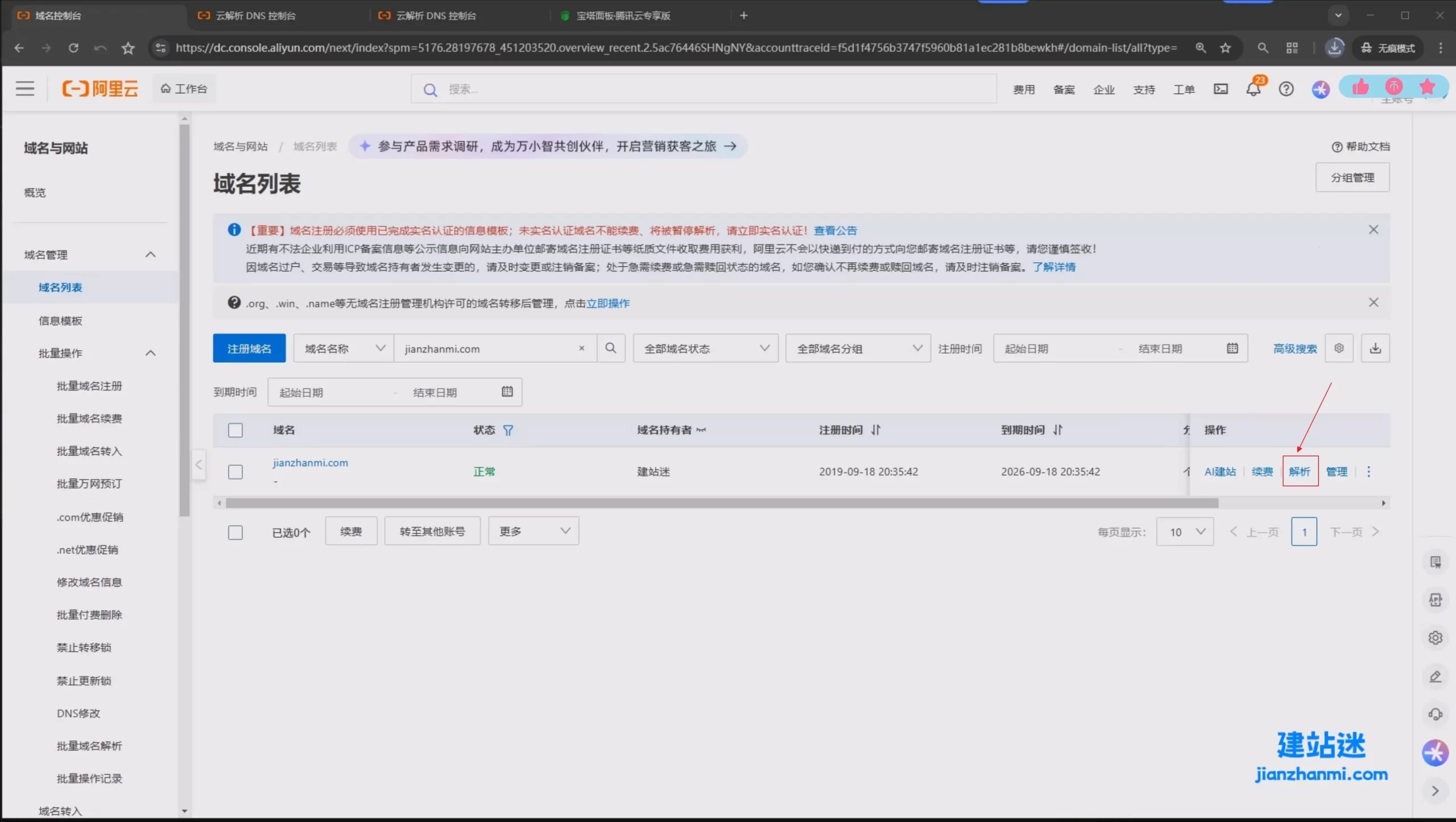 首先,来到阿里云域名控制台,找到目标域名 jianzhanmi.com,点击【解析】。