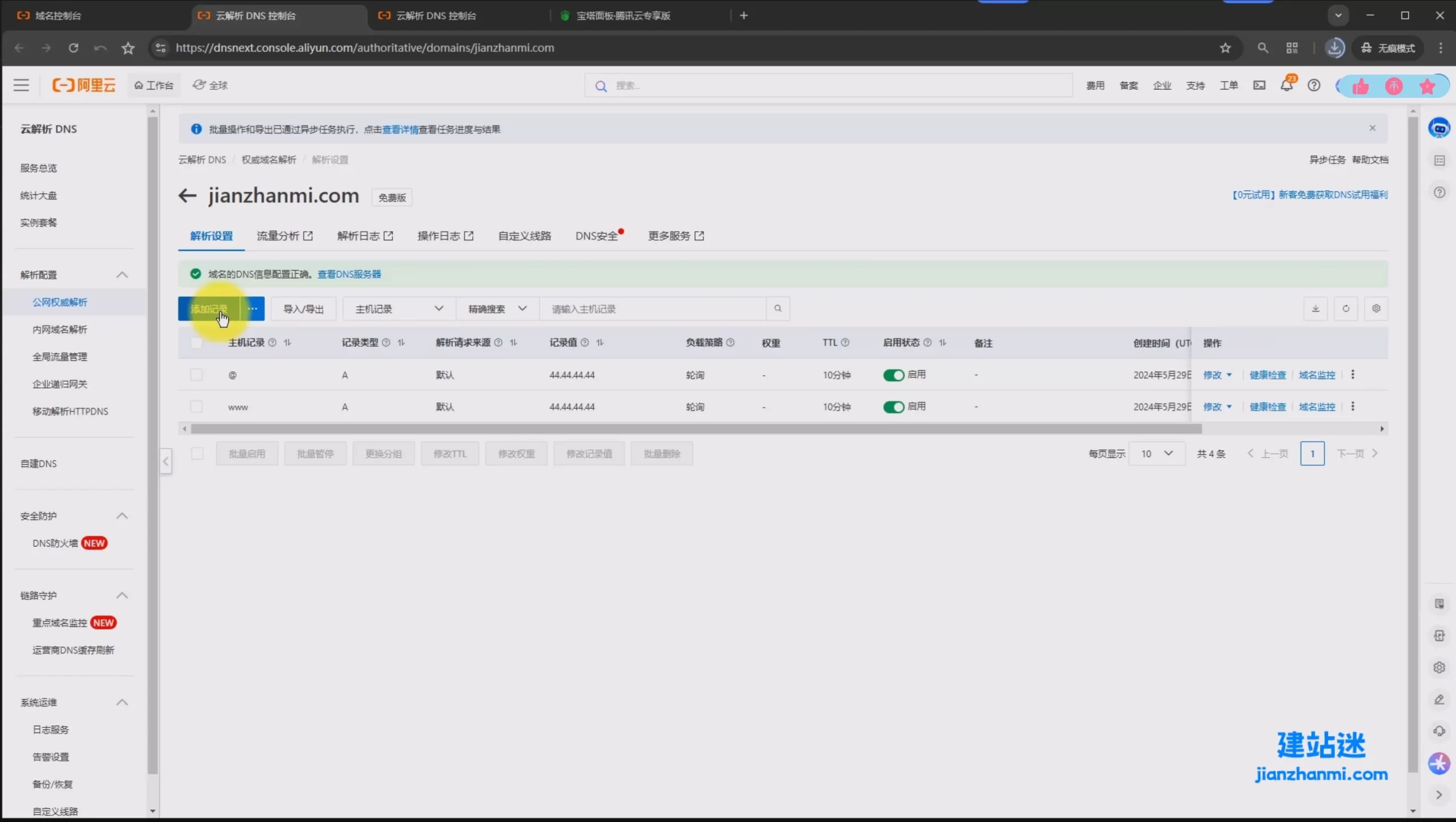 之后,会跳转到域名解析页面,点击【添加记录】。