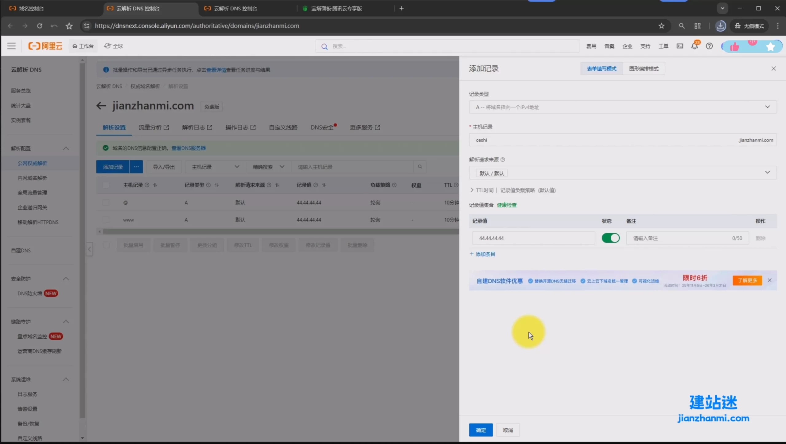 这时,会出现一个悬浮窗,把 记录类型设置为【A】,主机记录设置为【你想要解析的前缀,如果你想解析 www.jianzhanmi.com ,那么就填写 www;如果想解析 jianzhanmi.com,那就填写 @】,记录值填写【服务器的IP地址】。