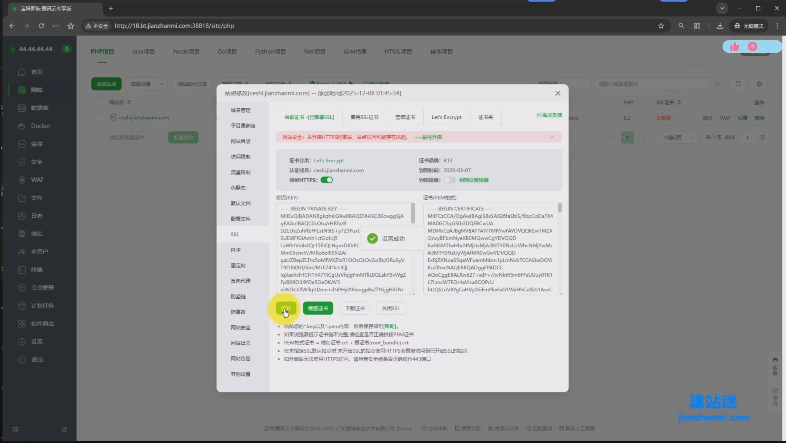 申请成功后,开启【强制HTTPS】,最后记得【保存】。